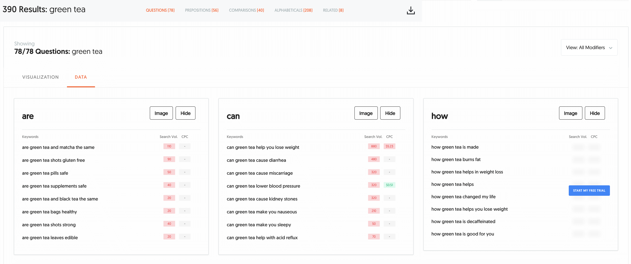 It’s designed to help you create ultra-relevant content that your audience wants to read. Once you enter your parent search term, it pulls up a list of questions, grouped by prepositions.