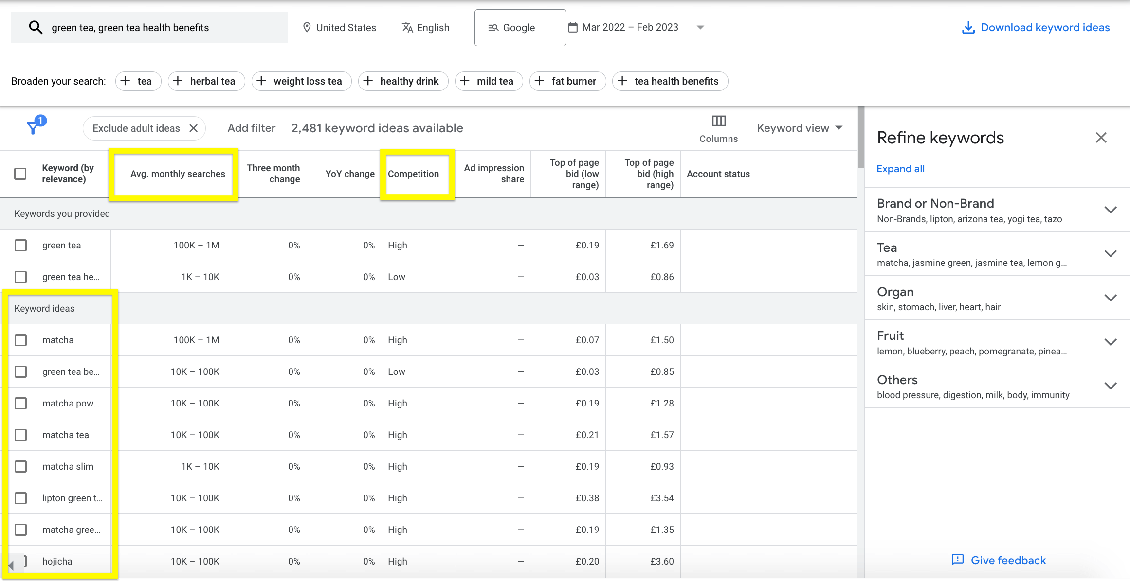 Google Keyword Planner green tea health benefits results.