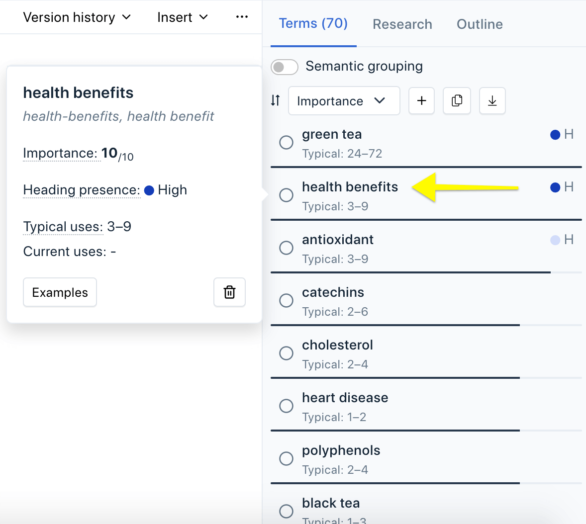 Example Clearscope draft terms tab for green tea health benefits.