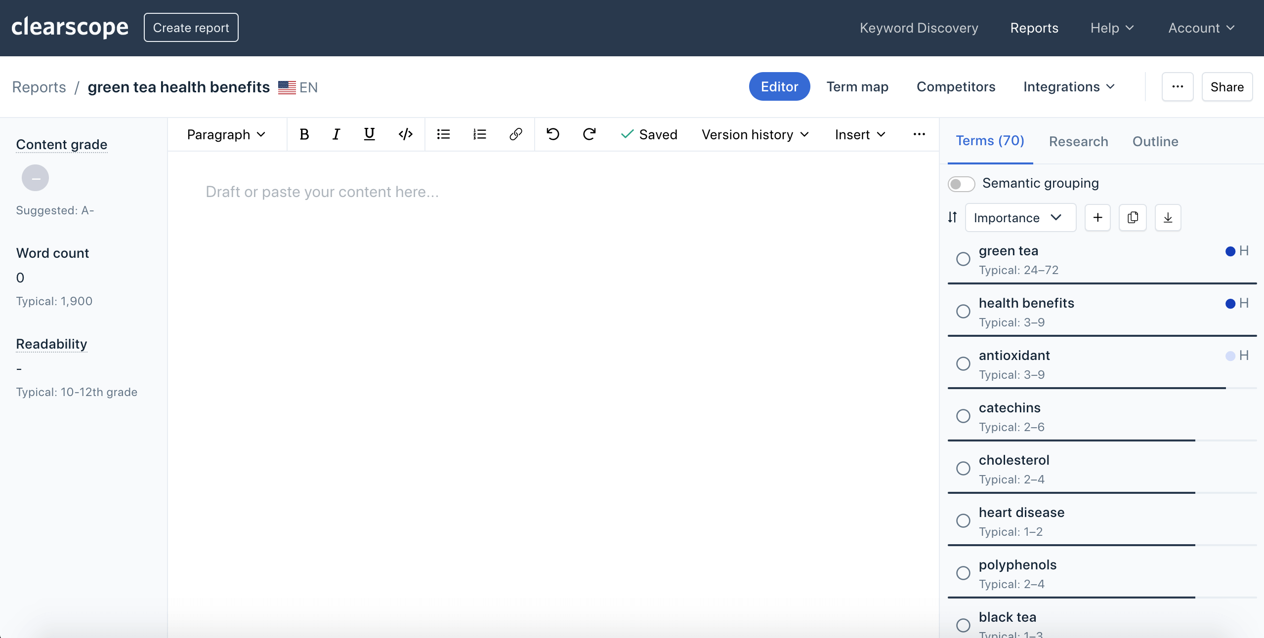 Here’s an example of Clearscope draft for the phrase “green tea health benefits”: