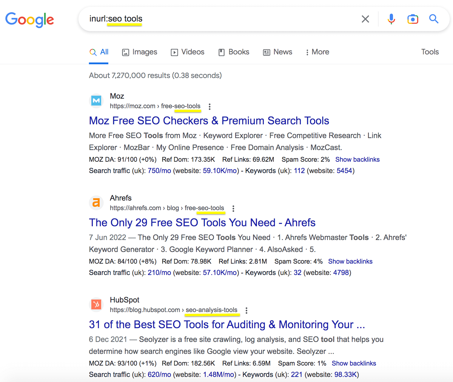 Google search command inurl: seo tools serps.
