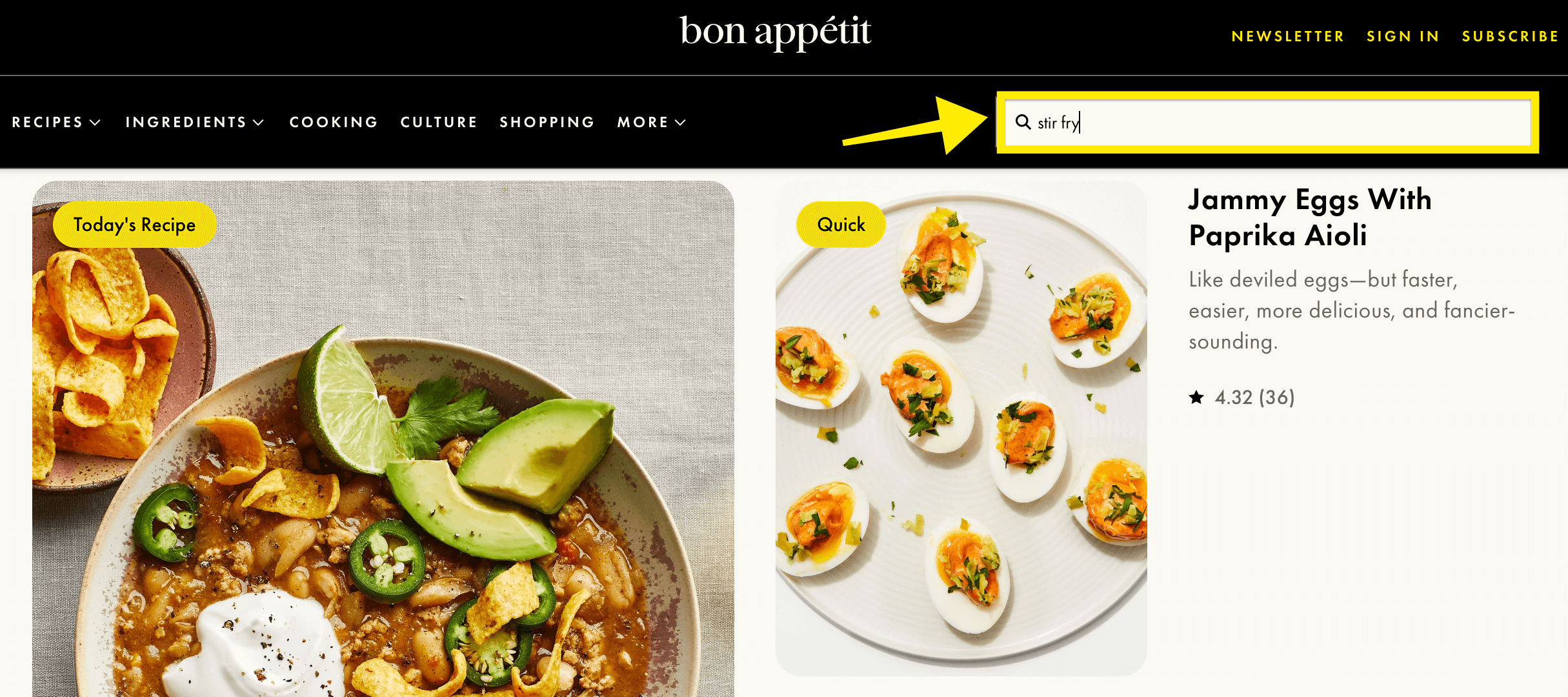 Website search box to find keywords Bon Apetit homepage.