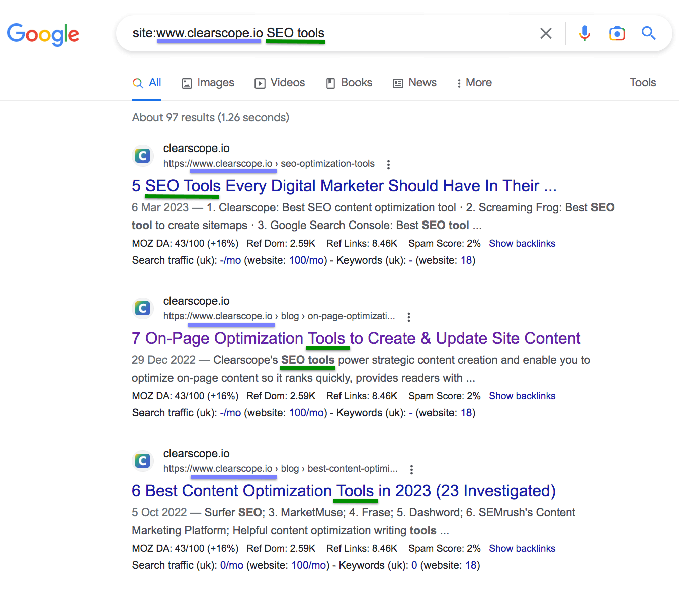 Then add the keyword after the domain (e.g., “site:www.clearscope.io SEO tools”