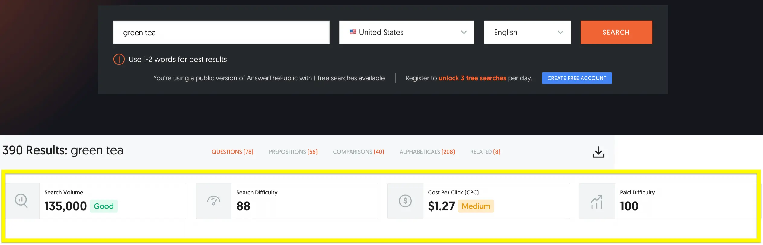 Answer the Public green tea keyword metrics.