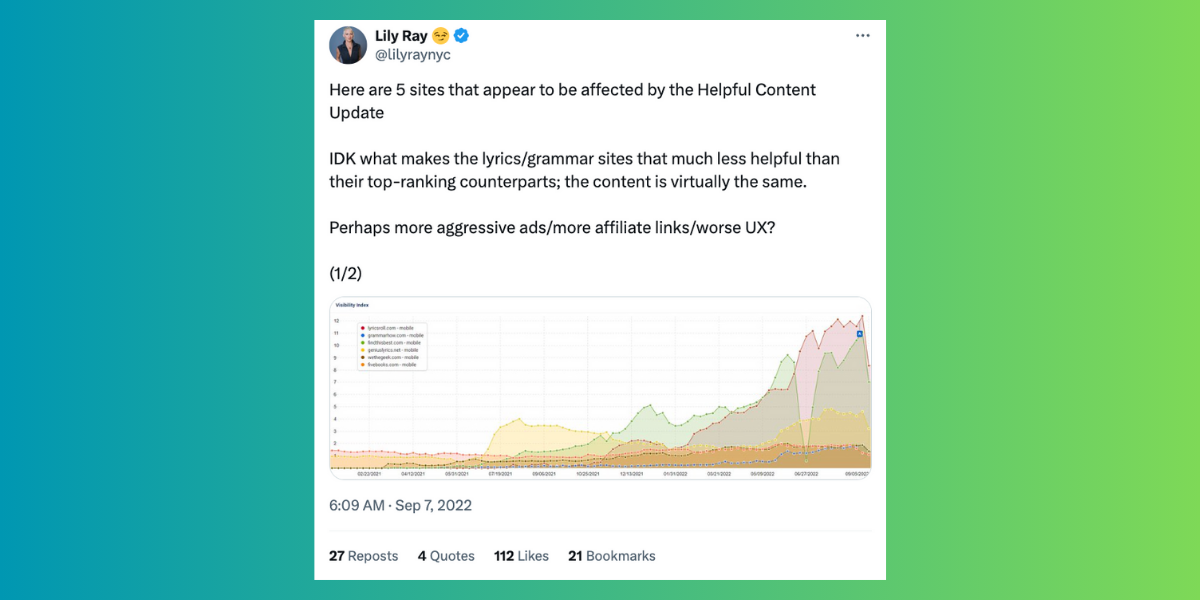 So it’s no wonder that first-person, perspective-driven experience was rewarded in Google’s 2023 updates, shown by Cyrus Shepard’s Google update case study.