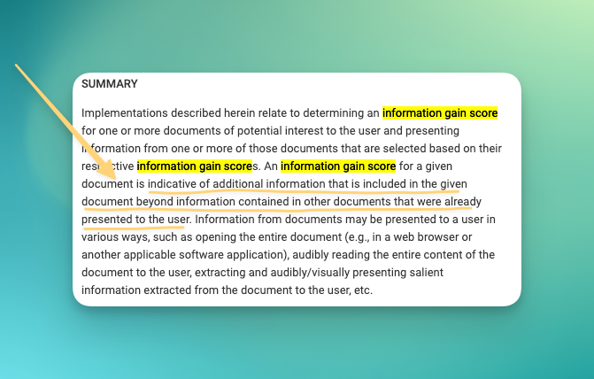 Additional information that is included in the document beyond information contained in documents that were previously viewed by the user. In some implementations, the information gain score may be determined for one or more documents by applying data from the documents across a machine learning model to generate an information gain score. (source)