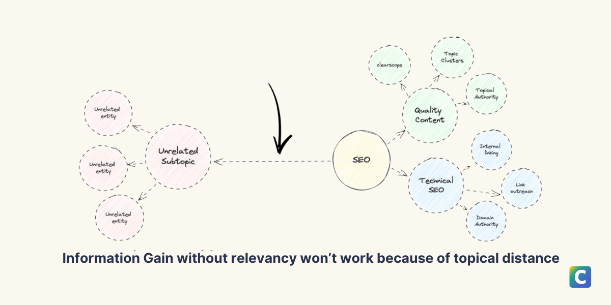 Introducing new concepts for the sake of adding information gain can be deemed irrelevant due to distance from core topic. For example, adding concepts like [ferrari], [lamborghini], and [bmw] to an article about SEO would add information gain without making much sense.