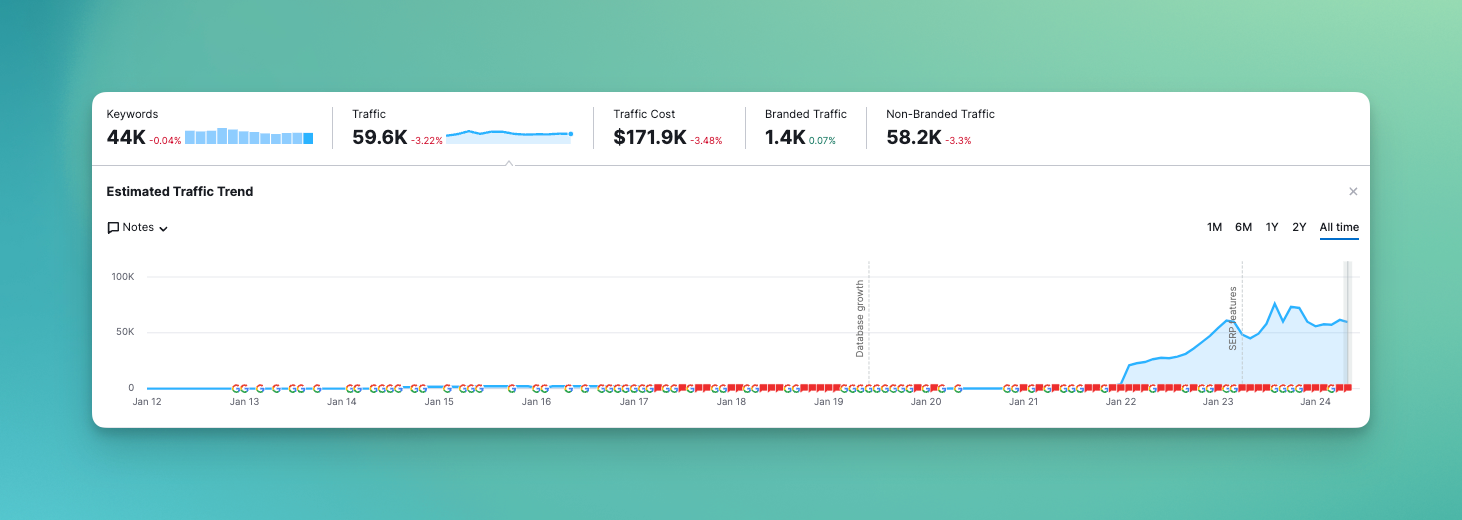 Organic traffic growth over time, fueled by a content-led SEO strategy focused on information gain. We grew the brand's topical authority by utilizing expert opinions, first-person perspectives, and developing "show and tell" type expert-reviewed content.