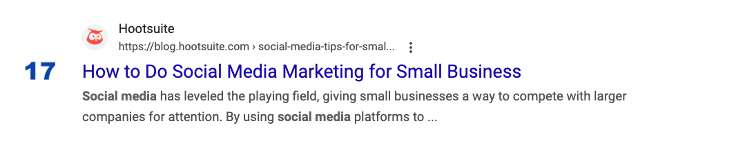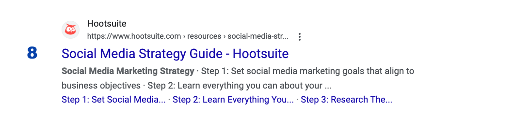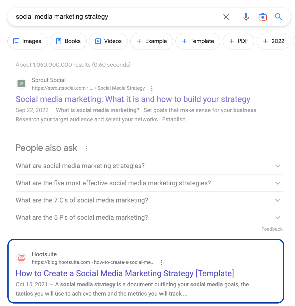 For example, if you search “social media marketing strategy,” an article from Hootsuite is in the second position.