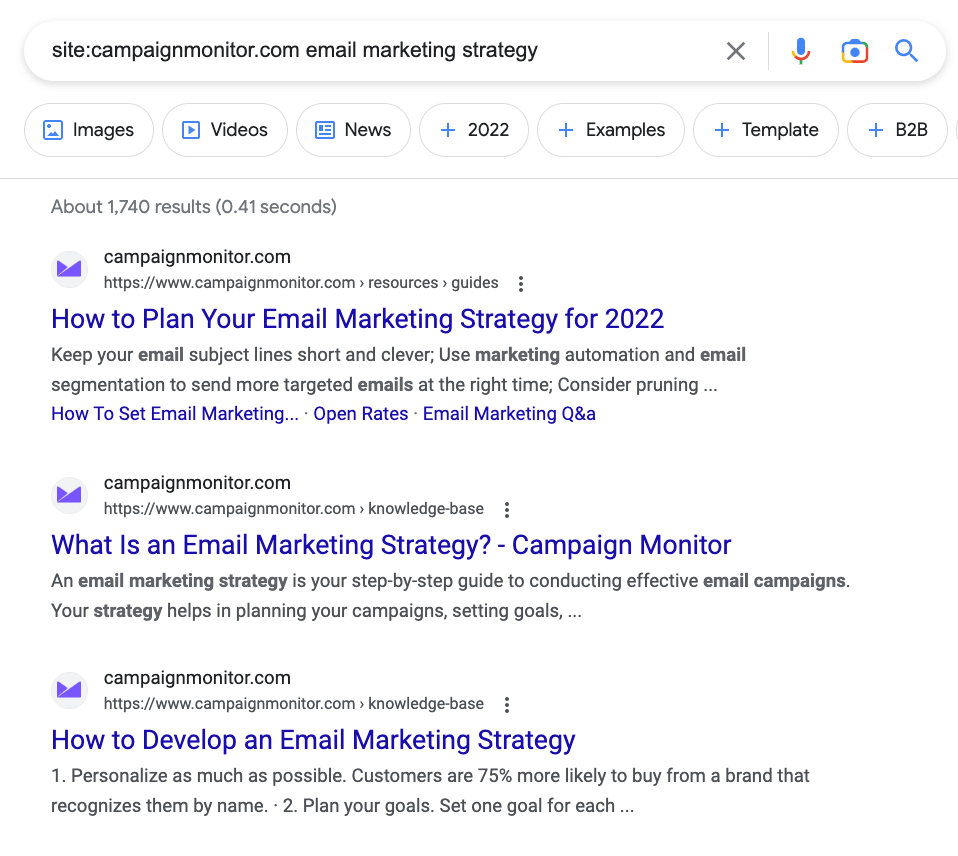 If we search for the same keyword while filtering for Campaign Monitor’s website, more results turn up.