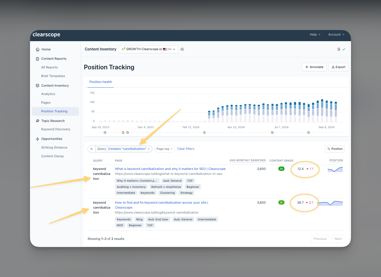 If you’re a Clearscope user, you can find possible cannibalized pages with the Position Tracking tool for any pages tracked in your Clearscope Inventory.