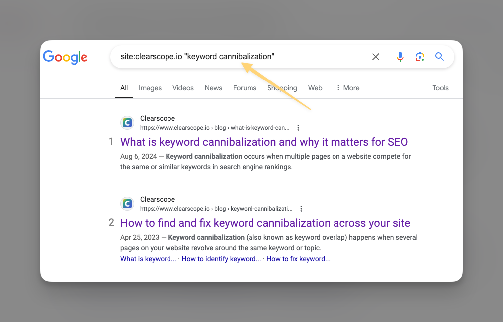 Here, you can see if I perform the site:search tip for [keyword cannibalization] on Clearscope's site, there are a few pages that pop up.
