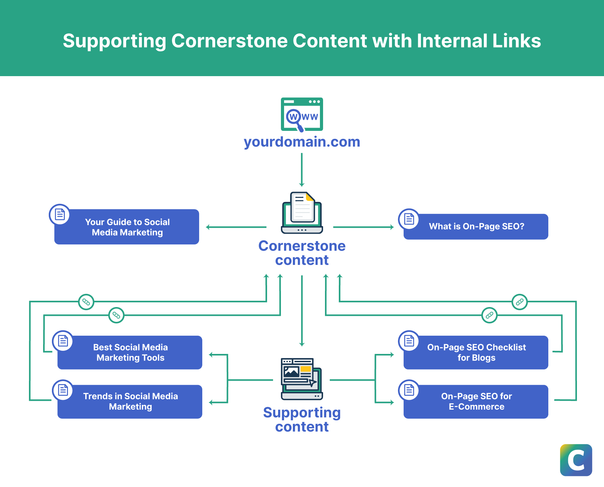 In other words, you use internal backlinks (or internal links) from your own domain to create a structure where lower-priority pages support your cornerstone articles.