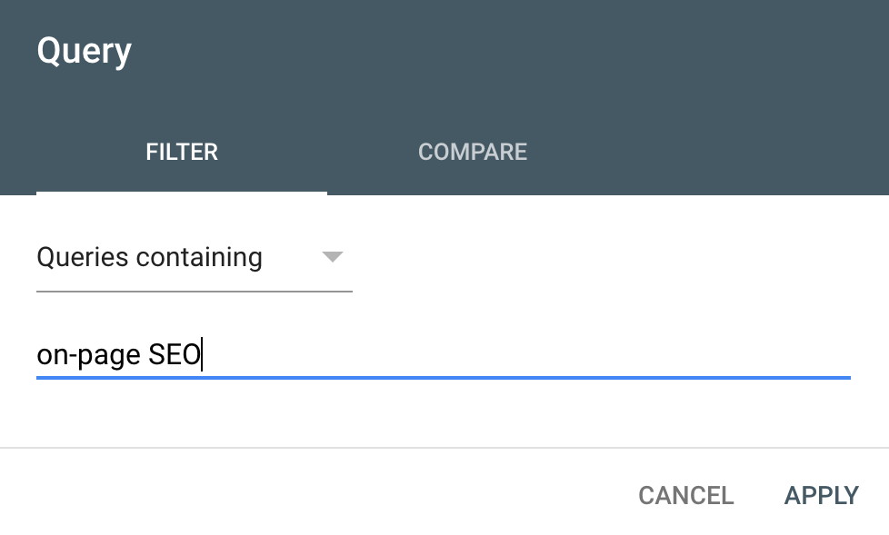 Google Search Console filter for queries containing the keyword “on-page SEO.”