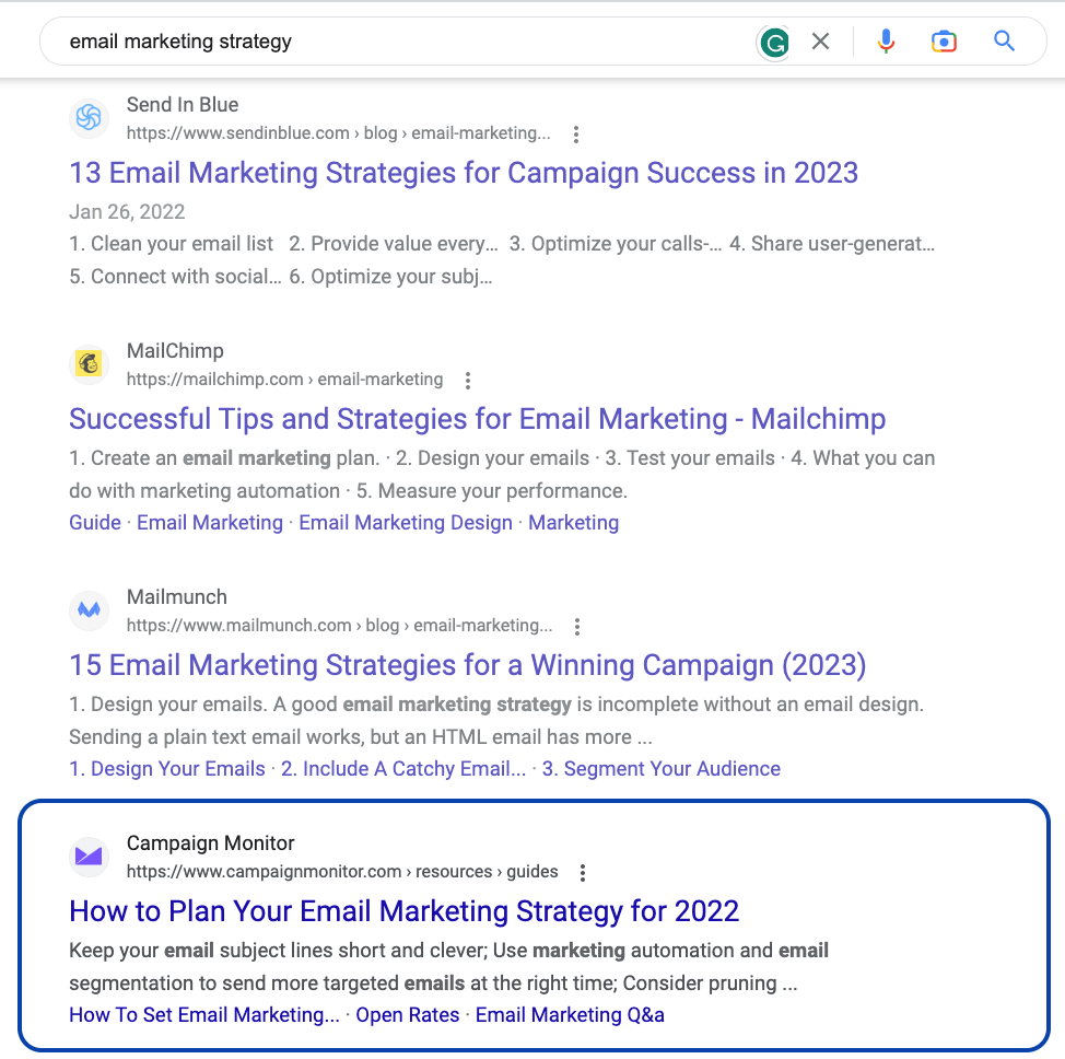 Here you can see that Campaign Monitor has an article called “How to Plan Your Email Marketing Strategy for 2022” on the first page.