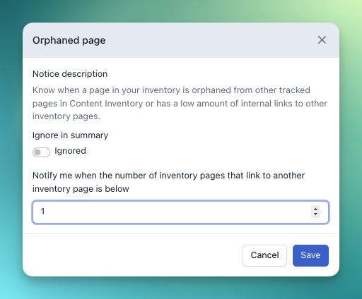 Get an Orphaned Page notice when a page in your Content Inventory falls short of specific internal linking thresholds that you set.