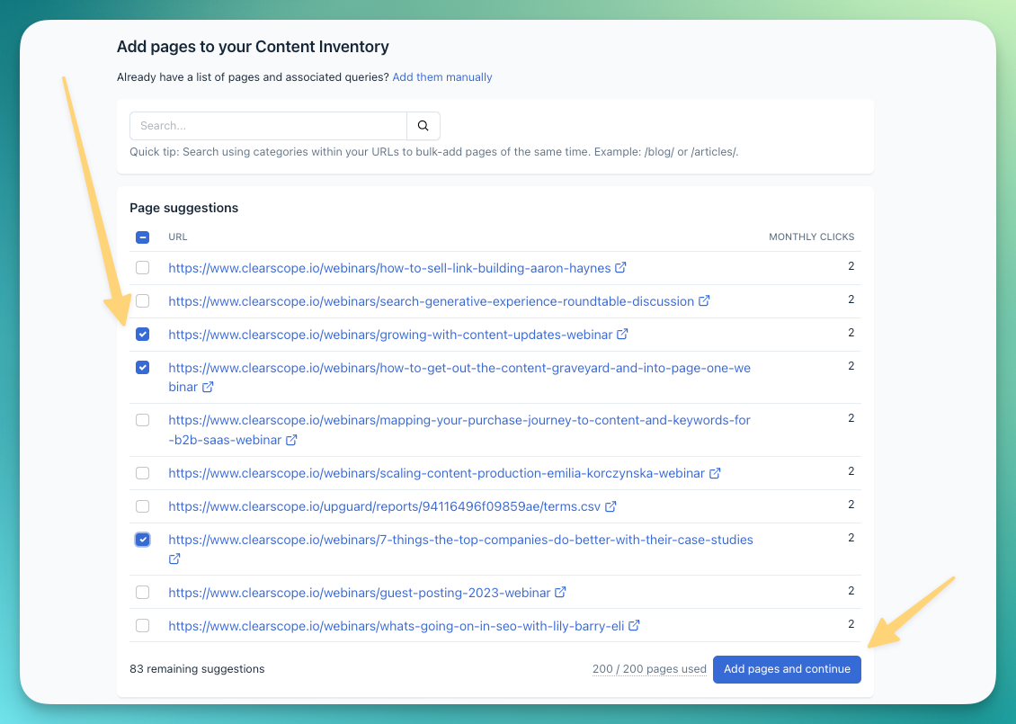 Clearscope automatically provides a list of suggestions of new pages to add, and you can select specific pages you’d like to monitor within your Content Inventory.