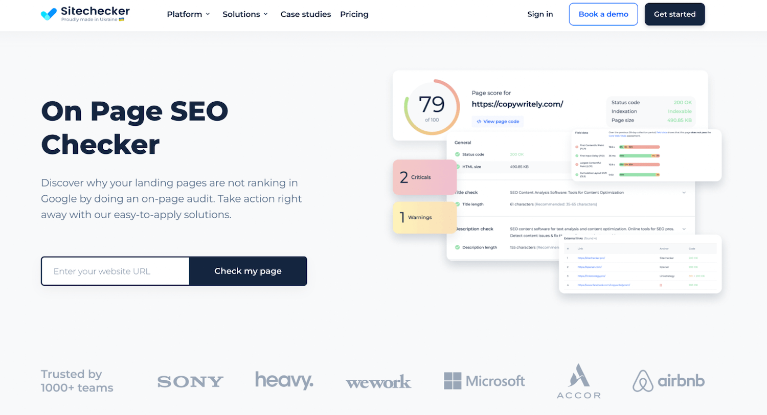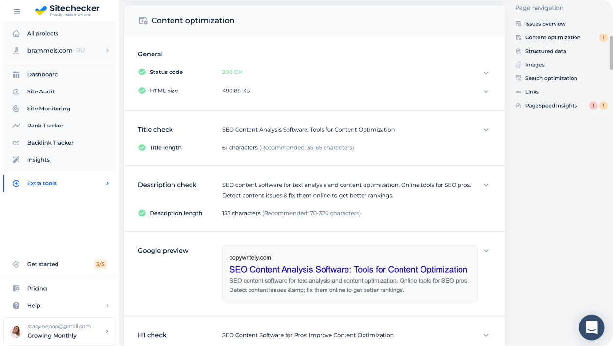 Now it’s time to dive deeper into page content by performing an on-page SEO audit — we recommend Sitechecker's SEO analysis tools for this step.