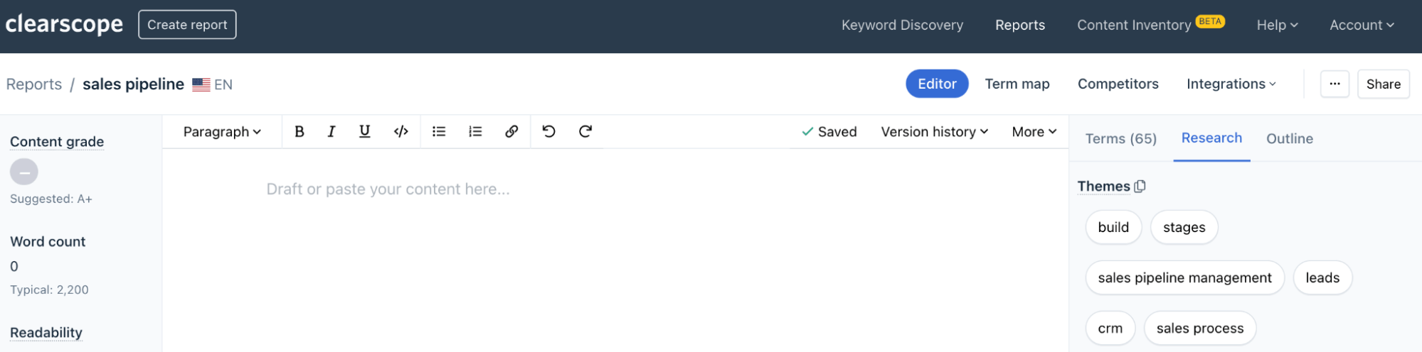 Clearscope draft showing themes related to the keyword “sales pipeline.”