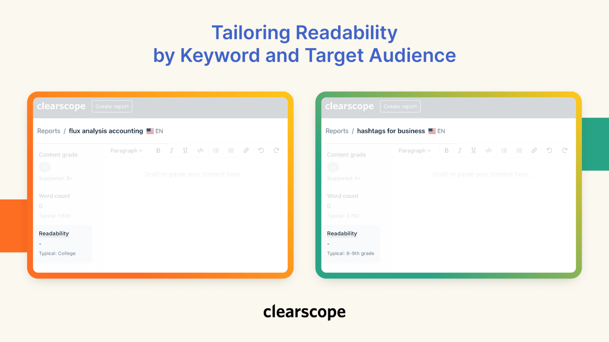In Clearscope, each keyword draft comes with a suggested readability level (based on the top-ranking articles), so you can tailor each of your pieces accordingly.