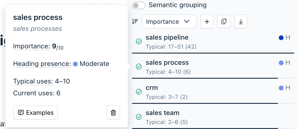 Clearscope lets you see common user questions and even use semantic grouping for keywords so you can identify opportunities to build more depth in each piece of content.
