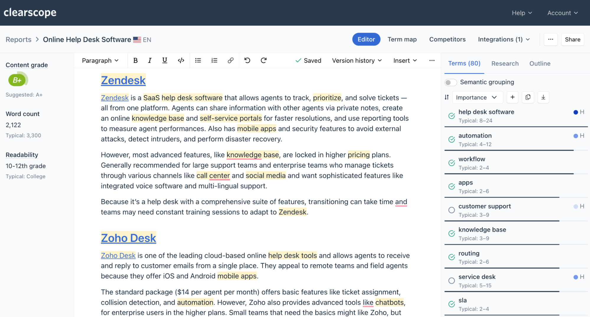 Once the rough draft is complete, editing and making final touches to content is easy: you can filter suggestions by “Unused” to incorporate leftover terms and achieve the recommended content grade, then review for spelling and grammar mistakes, check tone, and improve readability… as you likely already do in your normal workflows.