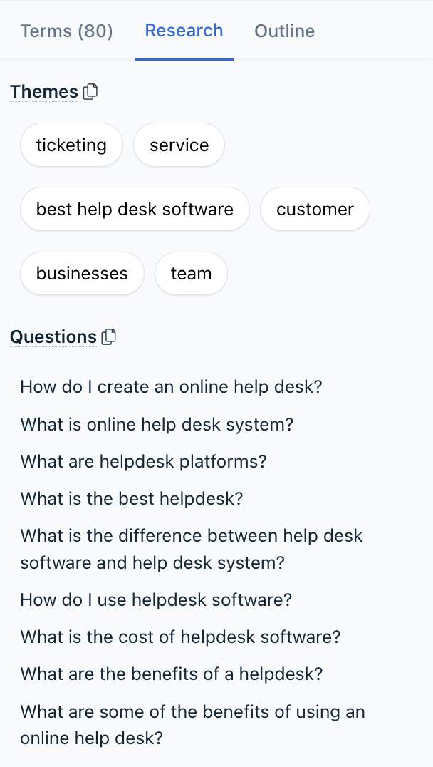 You can paste headings into your outline, but our reports also show suggested terms to use in headings (in the ‘Terms’ tab), so you can draft your own. You can filter suggested terms by “Heading” to see all of the heading ideas. It’s also a good idea to consider the themes and FAQs (from the ‘Research’ tab above) as you create your outline.