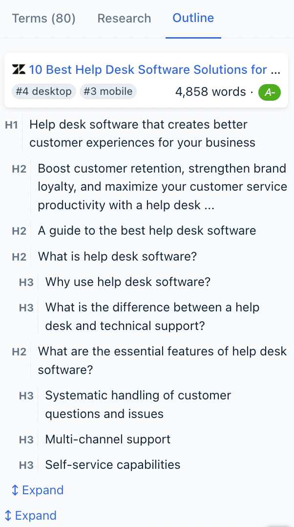 An outline builder that lets you drag and drop headers from competing posts into your content. (AI can also write headings for you.)