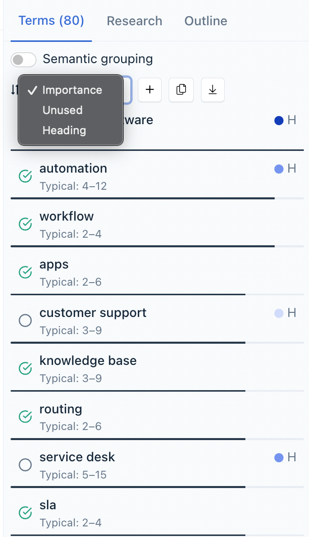 Finally, when it comes time to write content, we show you topics and terms to cover so you can write and optimize content at the same time. It’s a good idea to review the list of terms before writing — you can even use the semantic grouping feature to organize similar terms and get a broad idea of the topics you need to cover.