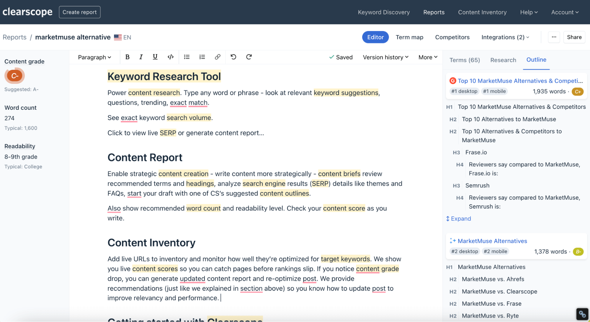 Clearscope Reports has a built-in Editor, and we also have an integration with Google Docs, so you can make changes in either of those tools and copy the content over.