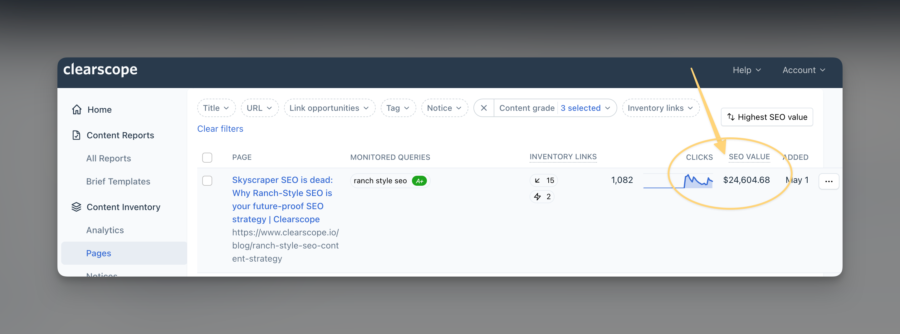 Clearscope’s platform makes this really easy, because we provide you with an automatically calculated SEO value metric for all the pages that are monitored in your Content Inventory. Get a demo.