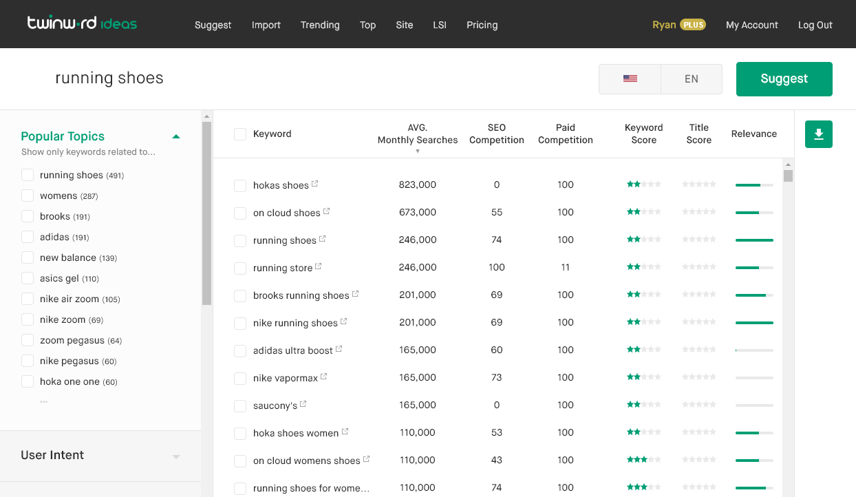 Struggling for ideas? Twinword is great at finding related keywords, grouping these by topic to make it easy to drill down. The “relevance” score lets you know how closely related the suggestion is to your starting word or phrase.