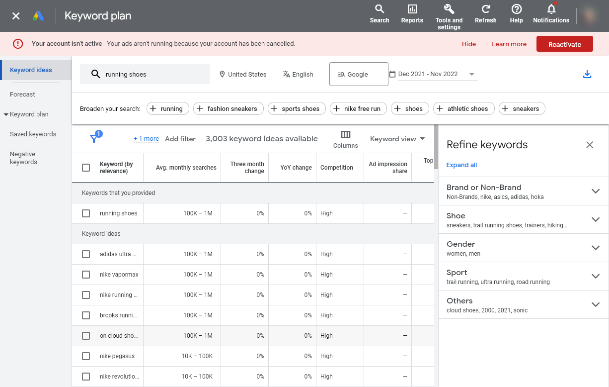 Google’s keyword planner’s “Discover New Keywords” feature lets you easily find relevant keyword ideas. You can choose to filter the results by country, and you can refine the keywords by deciding to target a specific gender, brand or non-brand, and so on, as well as viewing a number of different metrics.