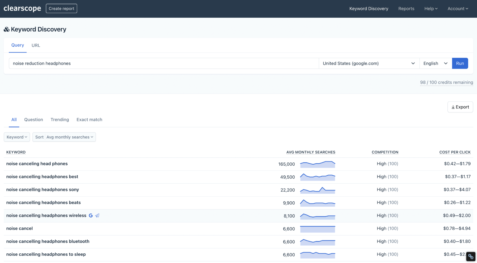 Once you’re ready to dig a little deeper with keywords, try Clearscope’s Keyword Discovery Tool. It’s included for free if you have a Clearscope account. (Plenty of content creators use Clearscope as one of their favorite SEO tools for content optimization, but not all of them realize that you can use Clearscope to come up with keywords in the first place.)