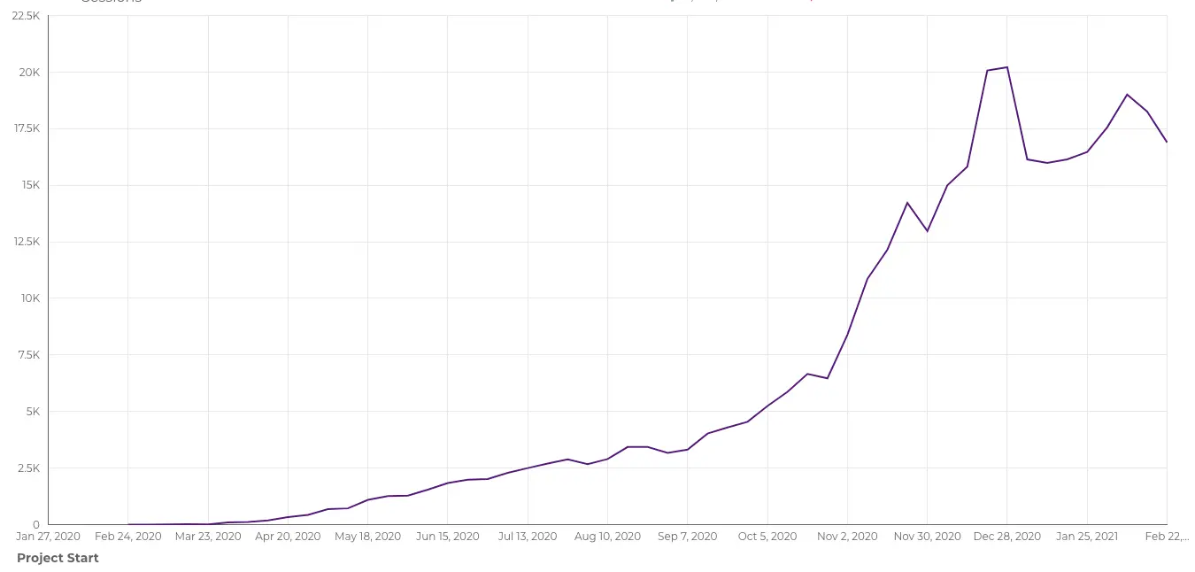In the fintech space, a Growth Machine client sees incredible gains during the 16-month project to date. The below chart shows the 1600% traffic increase across about 100 pieces of content.