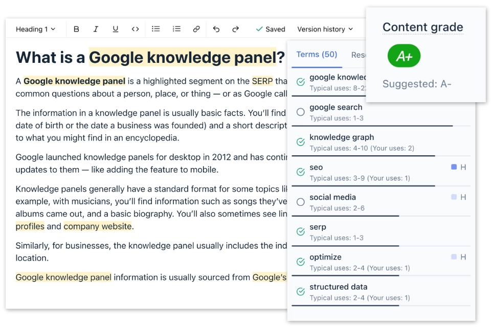 From keyword coverage to content quality, Clearscope gives you the real-time insights and trusted recommendations to make every piece publish-ready.