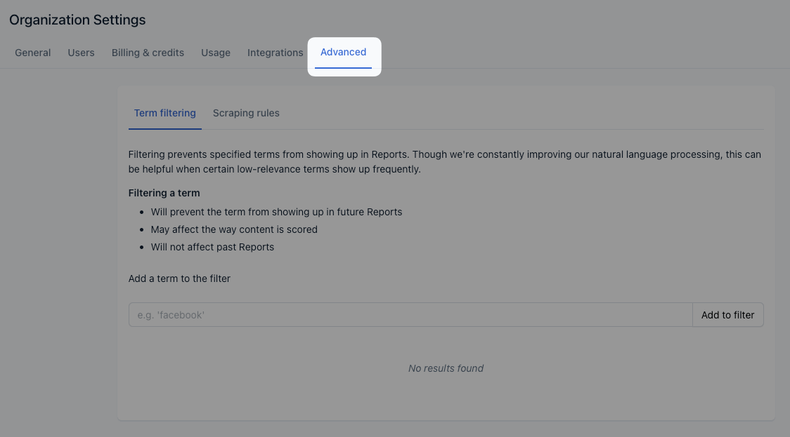 Once you’re on your Organization Settings screen, click the “Advanced” tab to add a filtered term and/or create a scraping rule.