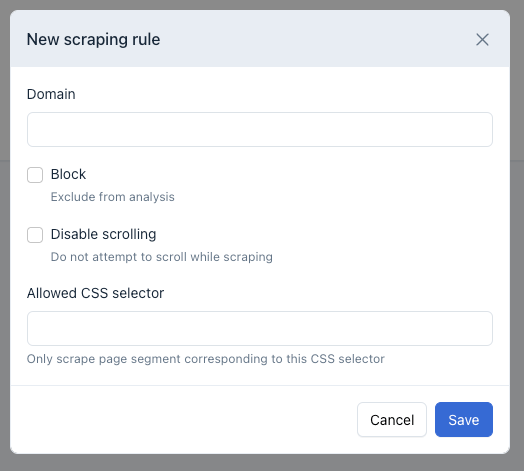 This opens a modal where you can enter the domain URL you want to exclude and whether you want to block the domain from Drafts analysis, disable the scrolling on the URL when Clearscope scrapes the content, and/or enter a CSS selector (which means we will only scrape the page segment corresponding to the CSS selector indicated).