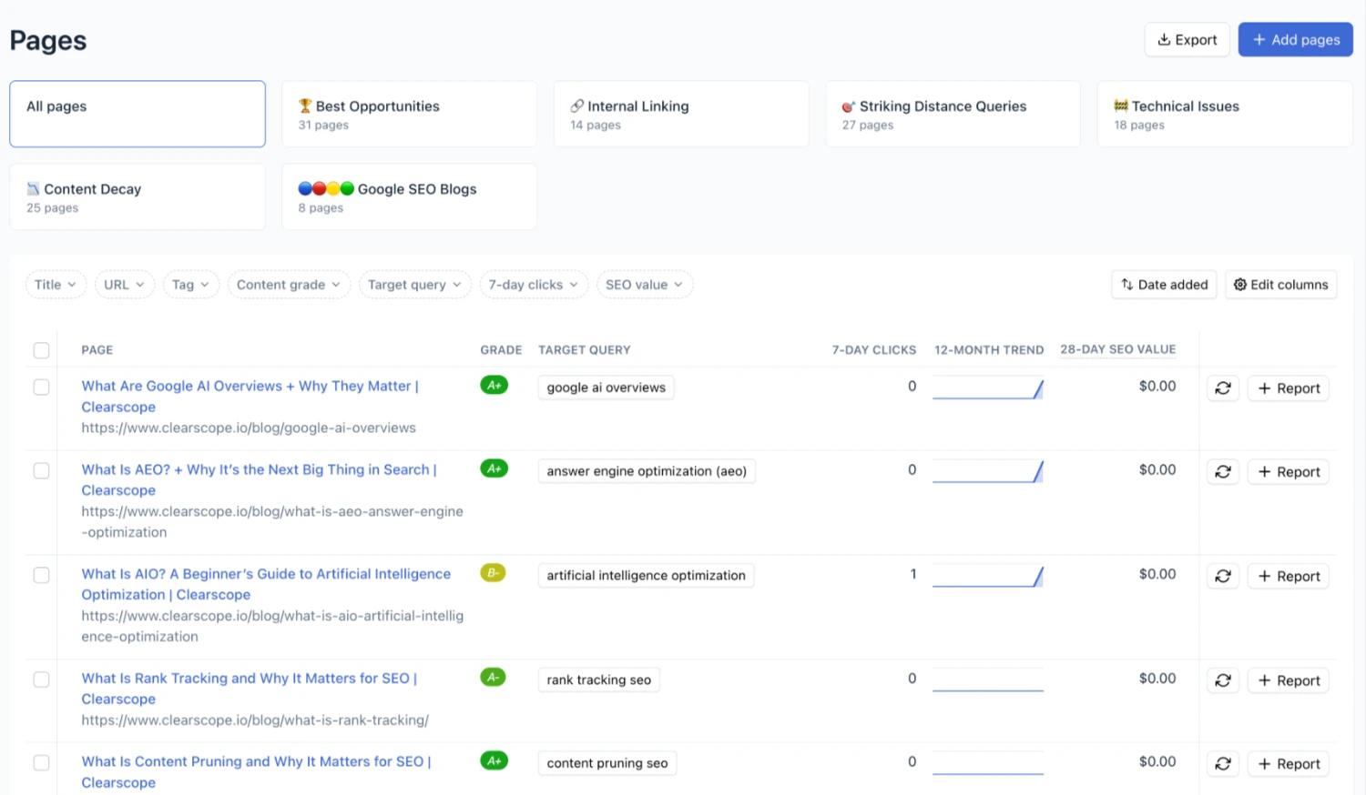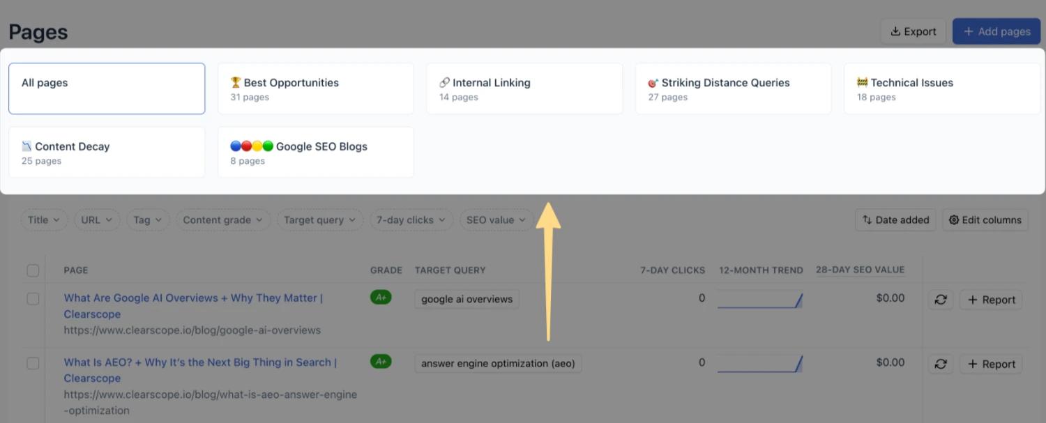 Content Views allow you to set specific metrics and filters to create page groupings, making it easier to monitor performance across topic clusters or strategic segments. Starter views are provided out-of-the-box, and you can create custom views tailored to your goals. Using filters and editable columns, you can create your own custom content views to analyze related content.