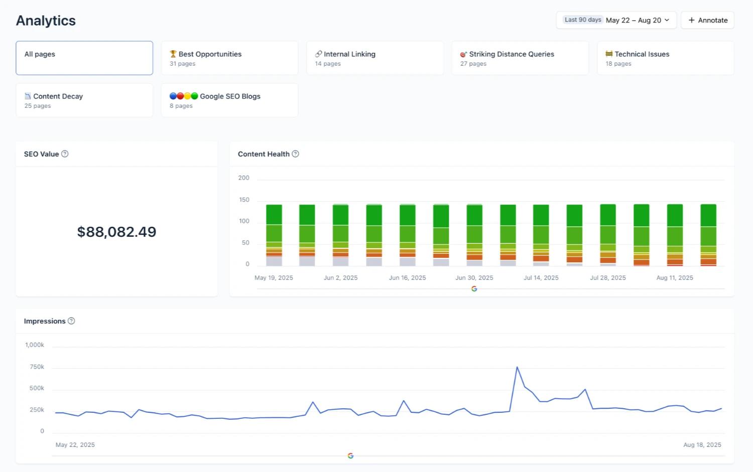 The Analytics tab provides a snapshot of your entire content library’s performance. You’ll see total impressions and clicks, a breakdown of Content Health by letter grade, and sortable views based on your saved Content Views. This overview helps you quickly assess the effectiveness of your content strategy and identify areas for improvement.