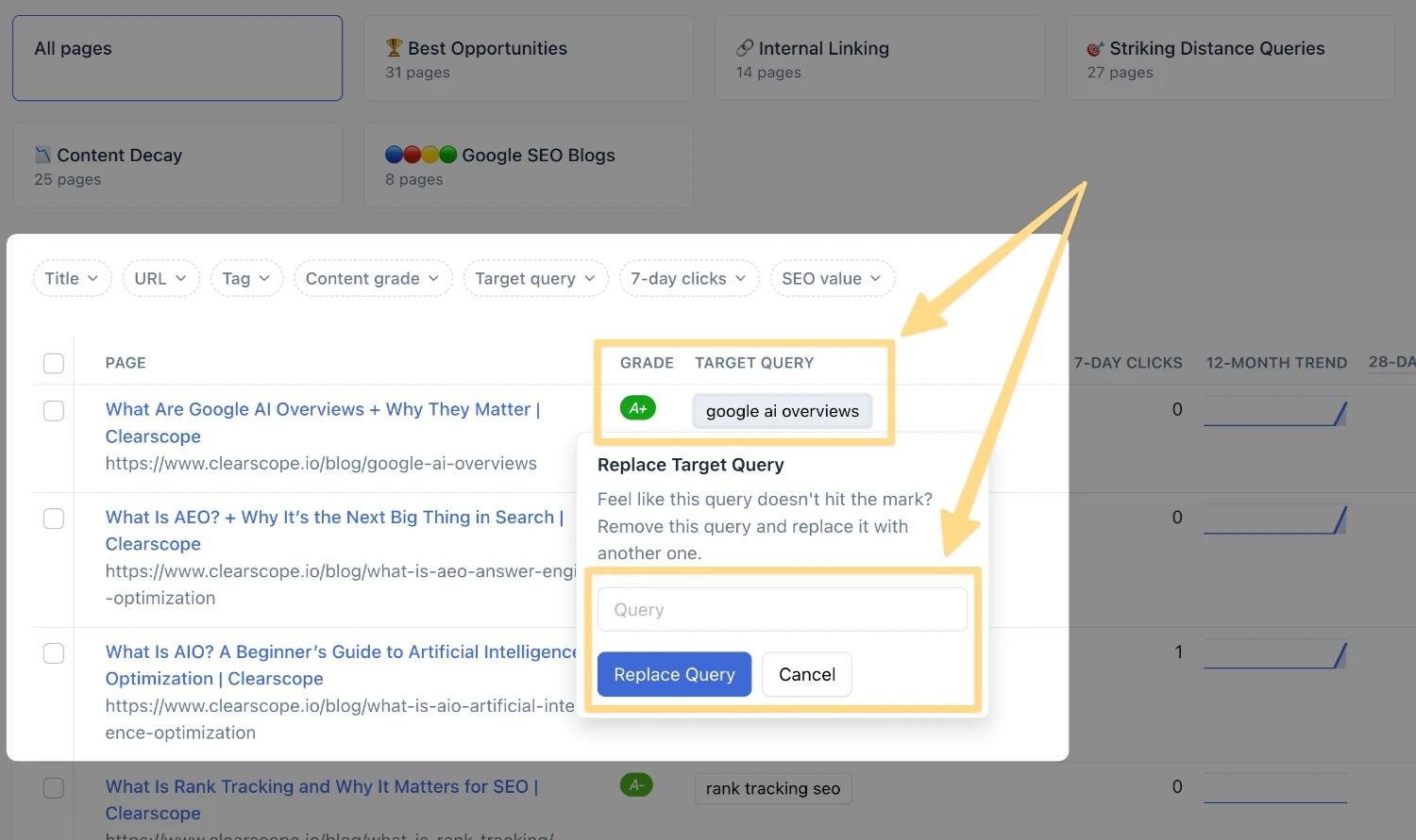Once a page is imported into your Content Inventory, we automatically assign a Target Query that reflects the most relevant search intent for that content. You’ll also receive a Content Grade based on how well the page aligns with that query. If the assigned query doesn’t match your goals, you can easily update it with a custom query to better reflect your optimization strategy.