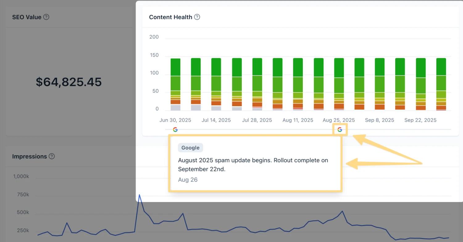 Clearscope will automatically log major Google algorithm changes so you can correlate performance shifts with external events. In addition, we'll also surface any major LLM version updates so you're aware of any changes that may impact your content's performance.