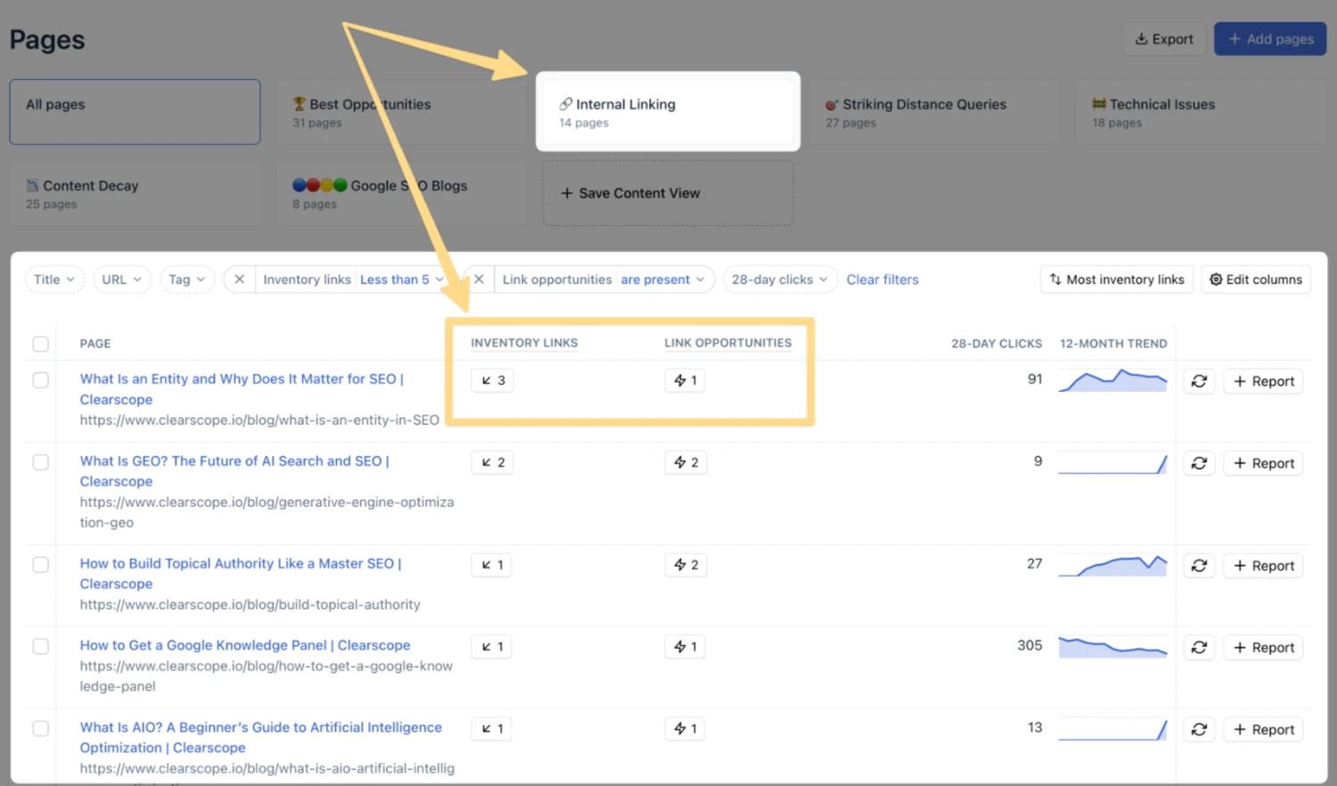 Content Inventory scans your entire content library to identify pages with related topics and recommends internal links to strengthen your site architecture. You’ll see how many links already exist and receive suggestions for new ones, including anchor text recommendations. This feature helps streamline your internal linking strategy and improve content discoverability.