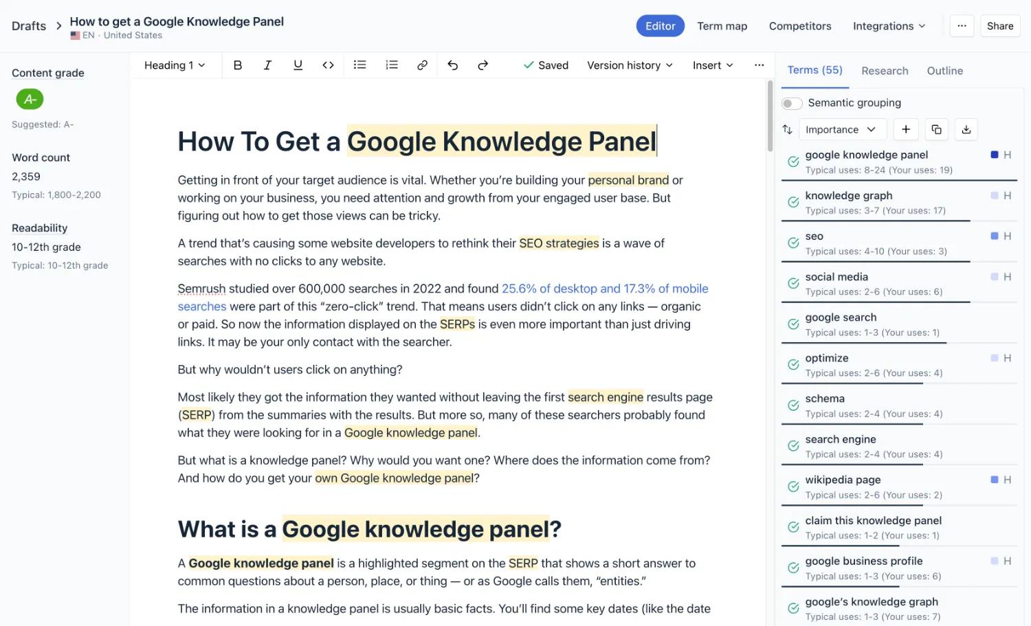 Drafts are Clearscope’s in-depth analysis of top search engine results pages (SERPs) for a targeted query. They help you create high-quality content optimized for SEO and AI results by providing recommended terms to include in your content, surfacing common questions your audience might have, getting you expected citation sources, and other real-time insights.