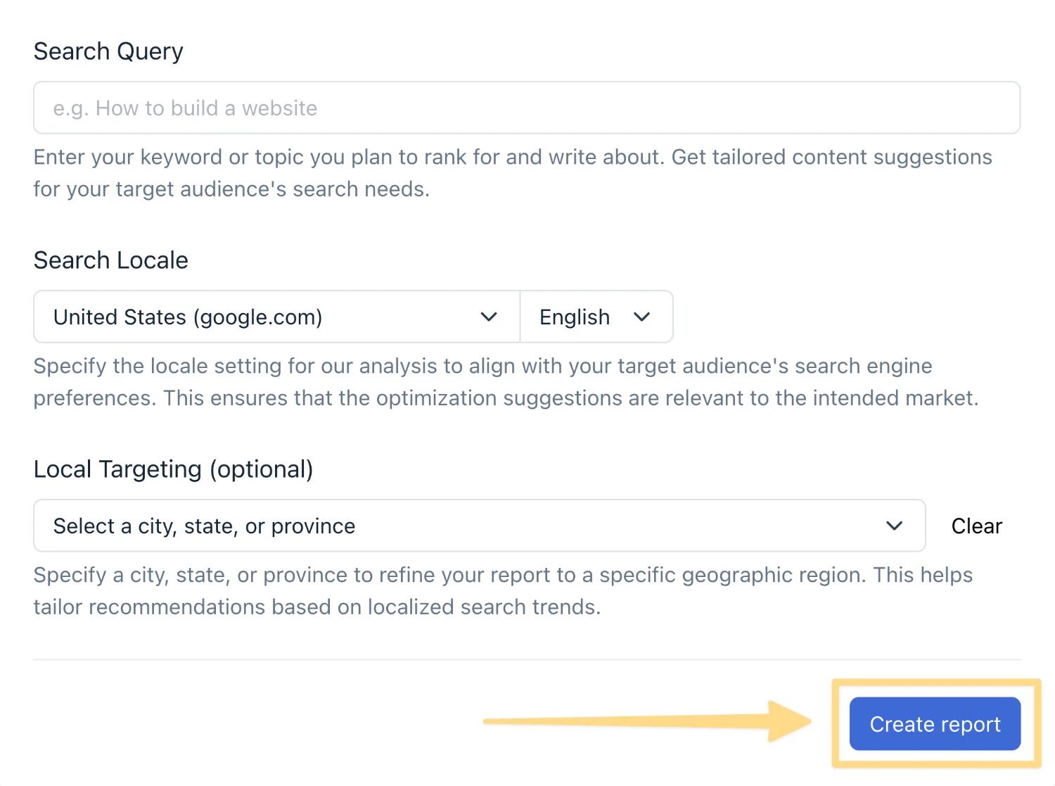 In this section, we’ll walk you through how to set up your draft—from entering your target search query to selecting locale and optional inputs that tailor the analysis to your needs.