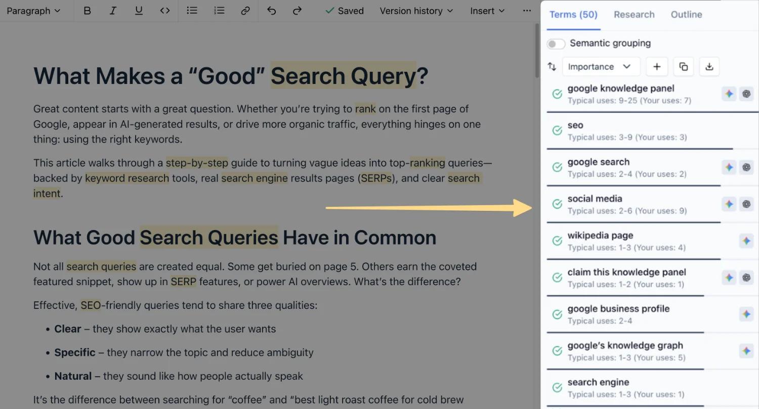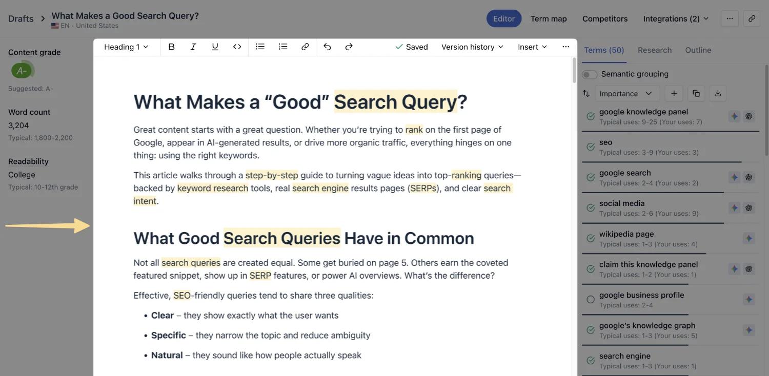 Begin writing your content directly within the Editor by actively integrating the recommended Terms, or answers to the key questions surfaced in the Research tab, into your content. Incorporating these terms and answers to common questions signals to search engines and AI platforms that your content is highly relevant to the topic while enhancing your content’s value and authority.