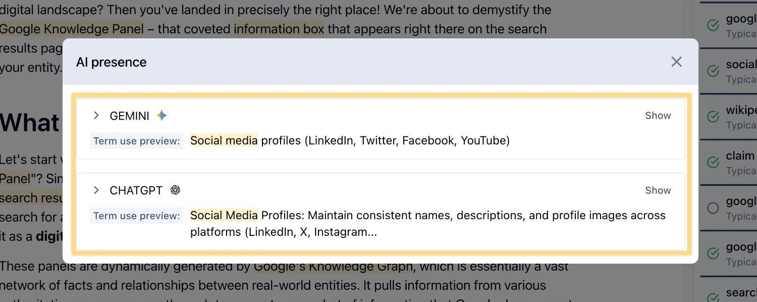 The AI Term Presence feature highlights when a suggested term shows up in AI‑generated responses related to your draft’s target query. This helps you understand which terms large language models are actively using and referencing when answering user searches.