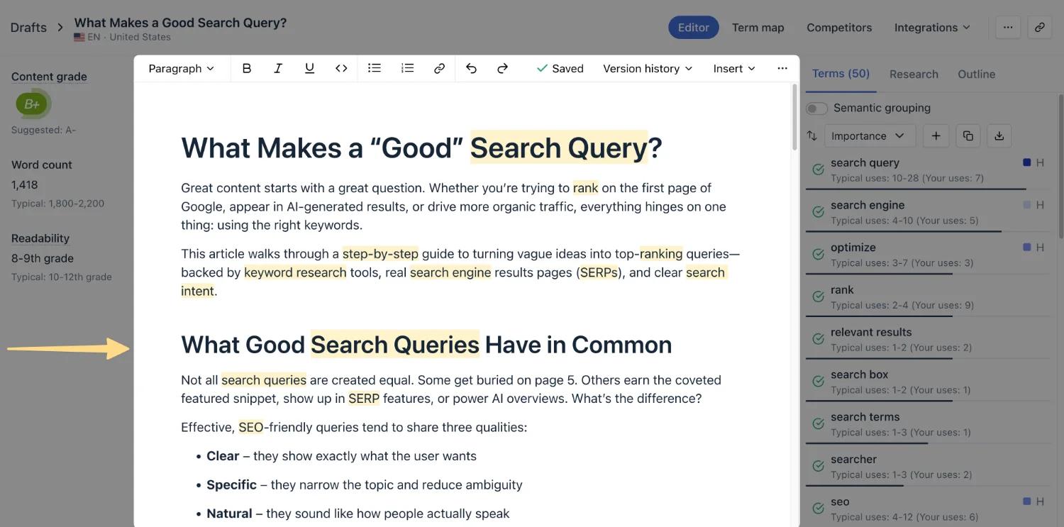 Located prominently at the top of the editor, the Content Grade is a real-time indicator of how well your content covers the topic and addresses user intent. It reflects the comprehensiveness and relevance of your writing in relation to the analyzed top-ranking content. Including more of these suggested terms will increase your Content Grade, with the highest score being an A++.