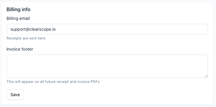 3. Scroll down the page until you find the “Billing info” section header. The email in this section shows the most recent way Clearscope sent billing information for the account subscription.
