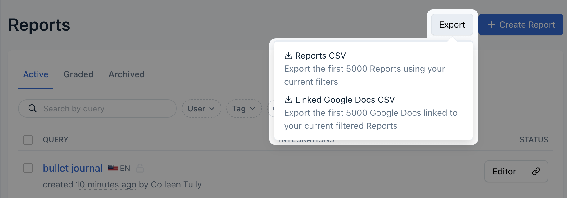 We offer two types of comma separated value (CSV) exports for all your Drafts: a downloadable file or linked Google Docs one.